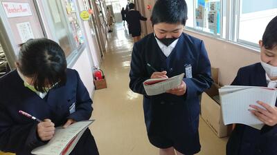 体育館から戻ってくると、さっき教室で確認していた学習のインタビューで、6年生が職員室に来ていました・・・。