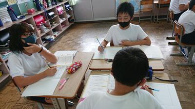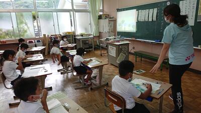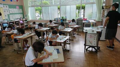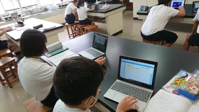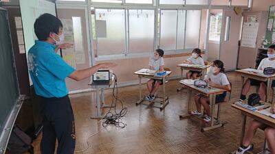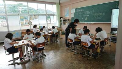 今日は、天草市教育委員会の先生、御所浦中学校の先生、東京からの学生さん(キャラバン隊)が来校されました。2時間目の5年生の国語の授業では、タブレット端末に自分の考えを残しながら、話し合いが行われました。児童は、緊張しながらも話し合いが少しずつ活発になっていく姿が見られました。緊張の中での授業、これも大切な経験です。