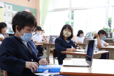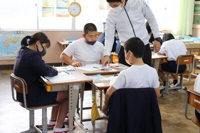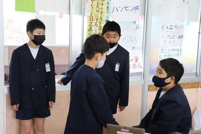 今日は、天草市教育委員会の先生、御所浦中学校の先生、東京からの学生さん(キャラバン隊)が来校されました。2時間目の5年生の国語の授業では、タブレット端末に自分の考えを残しながら、話し合いが行われました。児童は、緊張しながらも話し合いが少しずつ活発になっていく姿が見られました。緊張の中での授業、これも大切な経験です。