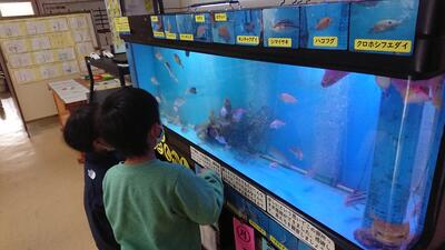 朝から子どもたちに囲まれる「ごしょっこ水族館」。今日も「わあ、きれいになってる!」と声をあげながら、1・2年生の子どもたちが水槽をのぞき込んでいました。昨日の放課後、保護者の方が掃除と海水の入れ替えをしてくださったおかげです。水槽の中では、鯛の稚魚がすくすくと成長しています。