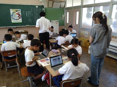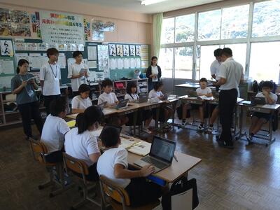 今日は、天草市教育委員会の先生、御所浦中学校の先生、東京からの学生さん(キャラバン隊)が来校されました。2時間目の5年生の国語の授業では、タブレット端末に自分の考えを残しながら、話し合いが行われました。児童は、緊張しながらも話し合いが少しずつ活発になっていく姿が見られました。緊張の中での授業、これも大切な経験です。