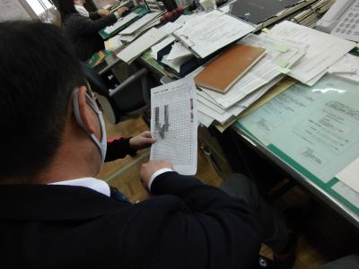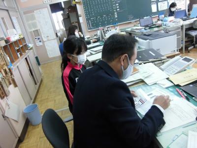 職員室の福山教頭先生のところに、なわとびチャレンジの申告に来ています・・・。
