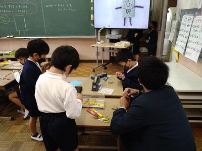 さて、授業のようすです。1年生は図工の「すみまちゃんのすきなすきま」。