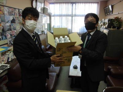 嵐口郵便局長、川中さまが来校され、局長会から、消毒アルコールポンプをいただきました。