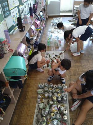 学習の様子からです。4年生は昨日集めた近くの海岸に流れ着いた海洋ゴミを分別します。