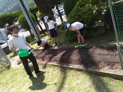 3年生は、オクラ、ヒマワリ、ホウセンカのタネを植えていました。
