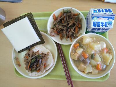 今日の給食です。きんぴらバーガー 新じゃがのそぼろに 牛乳 です。今日も美味しくいただきました。