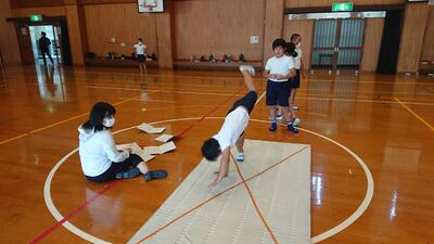 3年生と4年生の体育は合同でマット運動をしています・・・。