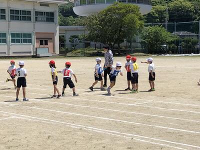1、2年生での初めてのリレー練習です。全員が色分け、番号わけされたゼッケンをつけているので、渡し間違えはありません。誰が誰に渡すのか、追い越すときは外からなど、指導の後、実際にリレーが行われました。1番内側を走るように先生も一緒によ~いドン!