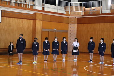 人権集会を行いました。人権主任の先生方からは、「自分のよいところに目を向けてみよう」というお話がありました。その後、縦割り班に分かれ、子どもたちは、友達のよいところをハート型の台紙に書き込んでいたものを手に紹介しました。誰のことが書かれているのか分からない班の友達は、発表を聞きながらドキドキしています。名前が明らかになると、紹介された子は嬉しそうに言葉を交わし、温かな雰囲気が広がりました。子どもたちが体育館を後にしたあとも、会場にはいつもより柔らかく、温かい空気が残っていました。