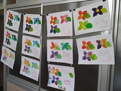 絵の具の花も掲示してありました。絵の具の色を混色して自分のイメージに合った色を作っていきます。