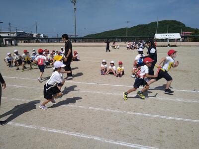1、2年生での初めてのリレー練習です。全員が色分け、番号わけされたゼッケンをつけているので、渡し間違えはありません。誰が誰に渡すのか、追い越すときは外からなど、指導の後、実際にリレーが行われました。1番内側を走るように先生も一緒によ~いドン!