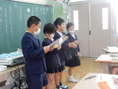 今日は、天草市教育委員会の先生、御所浦中学校の先生、東京からの学生さん(キャラバン隊)が来校されました。2時間目の5年生の国語の授業では、タブレット端末に自分の考えを残しながら、話し合いが行われました。児童は、緊張しながらも話し合いが少しずつ活発になっていく姿が見られました。緊張の中での授業、これも大切な経験です。