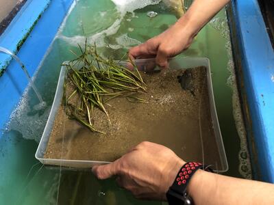 夕方、「アマモも入れてみよう!」ということで持ってきていただきました。アマモは、「海のゆりかご」とも言われます。