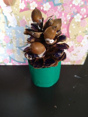 マツボックリツリーに飾り付け!!なんか素朴だけど、味のある作品に完成。