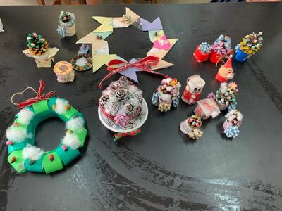 マツボックリツリー、リース、カラーリングマツボックリなど自分で作るものを決めてひたすら作ります。