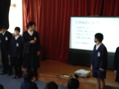 人権集会を行いました。人権主任の先生方からは、「自分のよいところに目を向けてみよう」というお話がありました。その後、縦割り班に分かれ、子どもたちは、友達のよいところをハート型の台紙に書き込んでいたものを手に紹介しました。誰のことが書かれているのか分からない班の友達は、発表を聞きながらドキドキしています。名前が明らかになると、紹介された子は嬉しそうに言葉を交わし、温かな雰囲気が広がりました。子どもたちが体育館を後にしたあとも、会場にはいつもより柔らかく、温かい空気が残っていました。