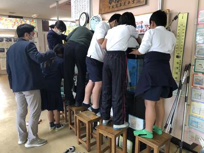 朝から子どもたちに囲まれる「ごしょっこ水族館」。今日も「わあ、きれいになってる!」と声をあげながら、1・2年生の子どもたちが水槽をのぞき込んでいました。昨日の放課後、保護者の方が掃除と海水の入れ替えをしてくださったおかげです。水槽の中では、鯛の稚魚がすくすくと成長しています。