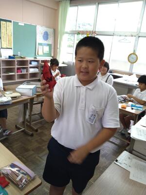 さて、5年生は学級マスコット「炎ちゃん」を家庭科の縫い取りの練習でつくっていました。
