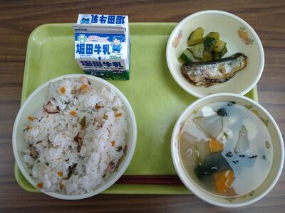 さて、今日の給食のテーマは天草!「たこ飯」「だご汁」「いわし煮」です。美味しくいただきました。