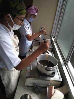 5年生は調理実習。ご飯と味噌汁つくりです。今日は昆布とカツオで出汁をとるそうです。本格的です。前回はいりこでとって具だくさん味噌汁でしたが、今日は老舗料亭(行ったことないのであくまでもイメージですが)の上品な味を目指して?頑張っていました。ちなみに写真は昆布から出汁をとっているところです。