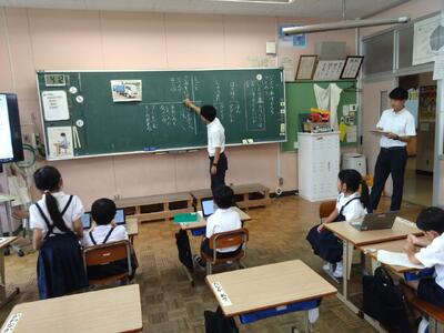 今日は、天草市教育委員会の先生、御所浦中学校の先生、東京からの学生さん(キャラバン隊)が来校されました。2時間目の5年生の国語の授業では、タブレット端末に自分の考えを残しながら、話し合いが行われました。児童は、緊張しながらも話し合いが少しずつ活発になっていく姿が見られました。緊張の中での授業、これも大切な経験です。