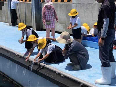 これまでヒラメや車エビの稚魚放流を経験させていただきましたが、今日はマダイの放流を体験しました。稚魚のつかみ方にも慣れてきたのか、これまで以上にスムーズに放流できていたと思います。