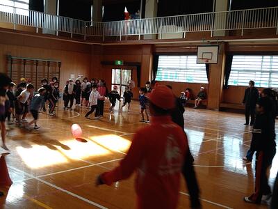 最初は1~3年VS6年生。6年生は下からのみ投げます。ボールは2個。