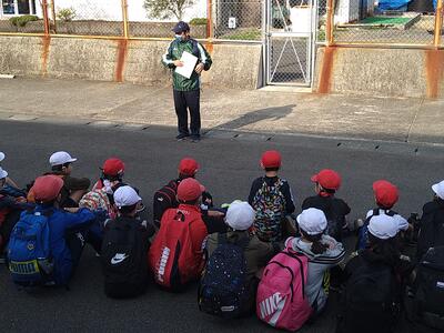 「嵐口地区コミュニティセンター」まで2.7kmぐらい。1・6年というように2学年一緒に歩いて行きます。