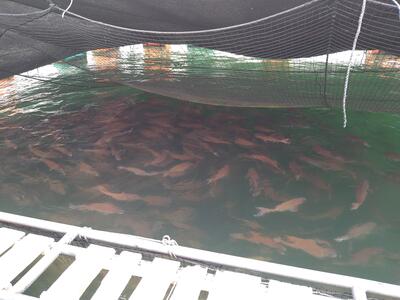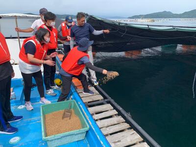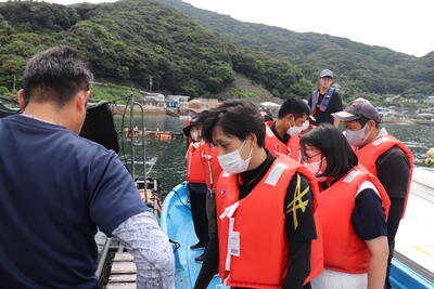 その後養殖いけすへ移動です。先日の赤潮でこのいけす周辺も水が濁っていたそうで、エサ止めをしてあったそうです。今日は、濁りは薄れていて、特別に少しだけ体験をさせていただきました。