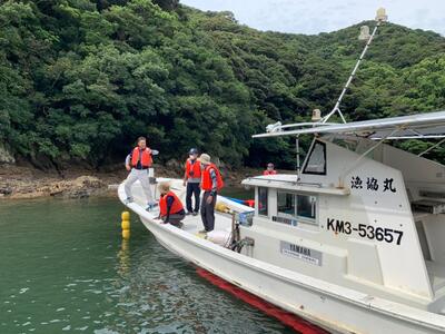 さて、御所浦小中合同研修として、午前中は「御所浦を学ぶ」と題して、「地質・化石学習コース」「アマモ・魚学習コース」の2コースに分かれ研修を行いました。目的は児童生徒の学びに生かすことです。