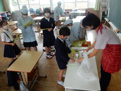 本日プリントを配布していますが、学校再開後子どもたちが持ってくるマスクの衛生面や紛失の未然防止にマスク袋が必要だと考え、休校中たくさんのご負担をおかけしたご家庭にさらなるご負担をかけることなく、学校職員でマスク袋を作ろうということになり、作製し、配布しています。