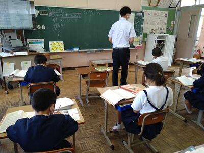 今日は、天草市教育委員会の先生、御所浦中学校の先生、東京からの学生さん(キャラバン隊)が来校されました。2時間目の5年生の国語の授業では、タブレット端末に自分の考えを残しながら、話し合いが行われました。児童は、緊張しながらも話し合いが少しずつ活発になっていく姿が見られました。緊張の中での授業、これも大切な経験です。