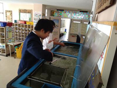 朝から子どもたちに囲まれる「ごしょっこ水族館」。今日も「わあ、きれいになってる!」と声をあげながら、1・2年生の子どもたちが水槽をのぞき込んでいました。昨日の放課後、保護者の方が掃除と海水の入れ替えをしてくださったおかげです。水槽の中では、鯛の稚魚がすくすくと成長しています。
