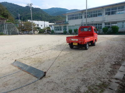 教頭先生が運転する赤いトラックが引いているのは「零式古川(改)」弐号・・・。