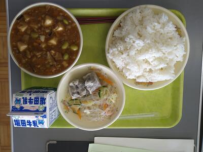 さて、今日の給食は、麻婆豆腐、ご飯、ひじきシュウマイ、春雨の酢の物でした。