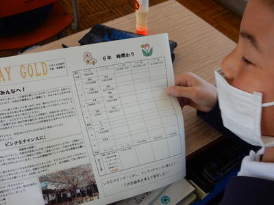 明日の水曜日からの時間割が空白になった学級通信を手に・・・。