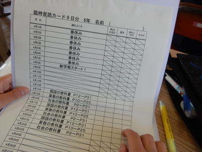 「これまでは先生が時間割を書き込んで配っていましたが明日からは自分で時間割を書き込んで学習を進めます。」