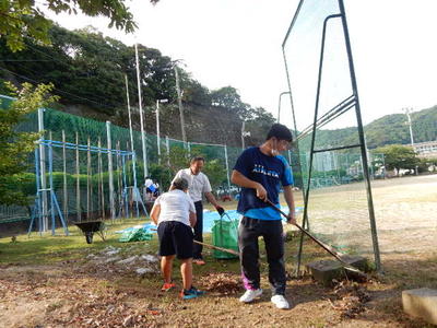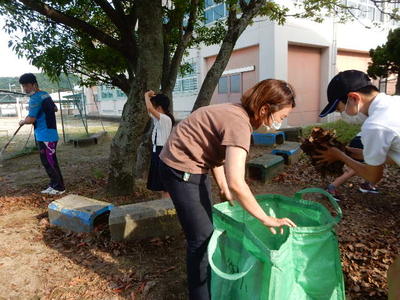 体育館横の運動場、昨日福山教頭先生が刈ってくれたのですが、落ち葉もなかなかの量だったので、今朝の朝ボラ依頼となったわけで、それに反応してくれた坂瀬先生が6年生等に呼びかけた流れなんですが・・・。