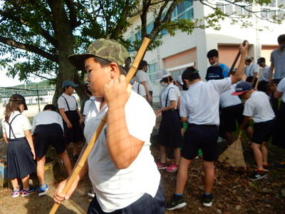 7月23日(水)、御所浦小中合同でボランティア活動を実施しました。中学校の生徒さん方がリードしながら、自分たちの地区で清掃活動に取り組みました。お菓子の袋やペットボトルなどのゴミを拾い、御所浦の環境をさらにきれいにしてくれた子どもたちです。ちなみに、写真の奥に見えるのは八代海です。遠くには九州山地も、うっすらと姿を見せていました。美しい景色と捨てられたゴミの対照が、なんとも印象的でした。