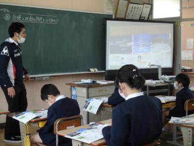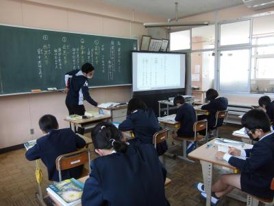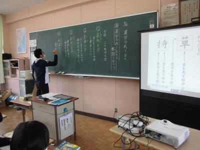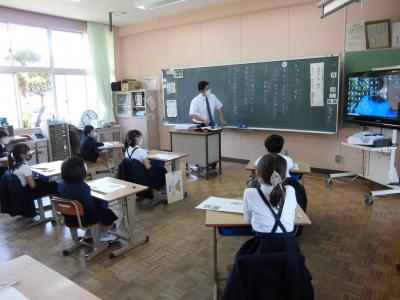 今日は、天草市教育委員会の先生、御所浦中学校の先生、東京からの学生さん(キャラバン隊)が来校されました。2時間目の5年生の国語の授業では、タブレット端末に自分の考えを残しながら、話し合いが行われました。児童は、緊張しながらも話し合いが少しずつ活発になっていく姿が見られました。緊張の中での授業、これも大切な経験です。