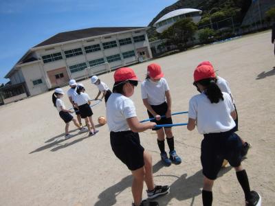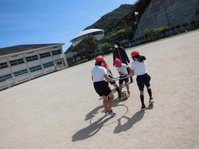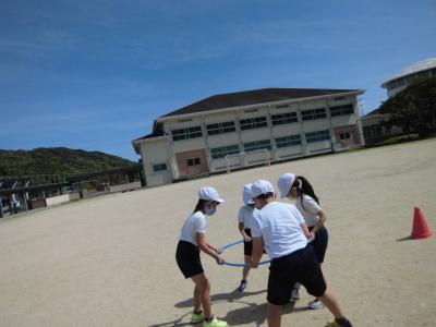 フープを4人で持ち、サッカーボールをコントロールしながら、折り返し競争・・・。