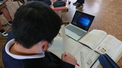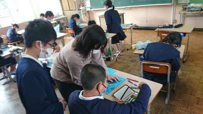 今日は、天草市教育委員会の先生、御所浦中学校の先生、東京からの学生さん(キャラバン隊)が来校されました。2時間目の5年生の国語の授業では、タブレット端末に自分の考えを残しながら、話し合いが行われました。児童は、緊張しながらも話し合いが少しずつ活発になっていく姿が見られました。緊張の中での授業、これも大切な経験です。