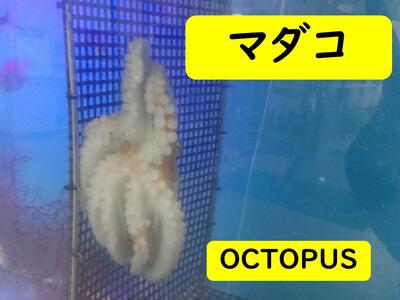 タコのおなかをじっくり観察することができる御所っ子水族館です。動かないようで、日々ポジショニングを変更しています。オクトボックスに滞在し触手を伸ばすマダコはまるで上弦の陸・・・。