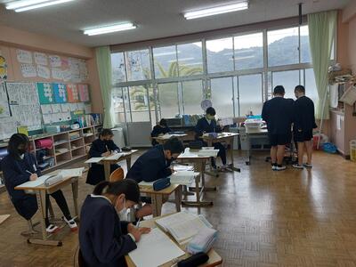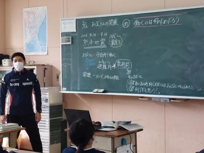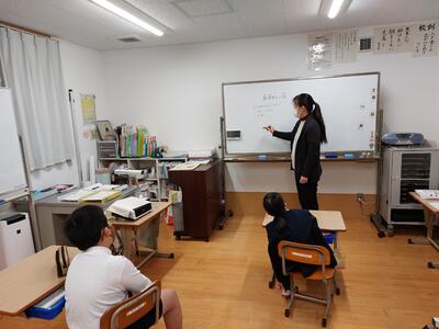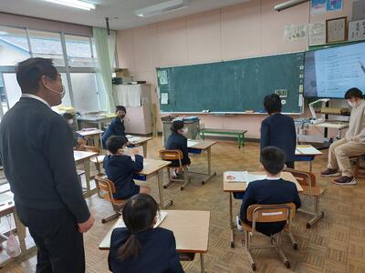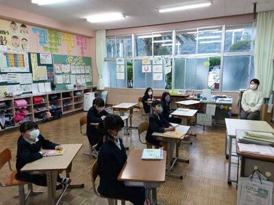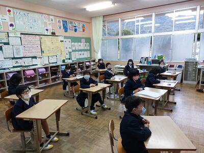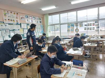 今日は、天草市教育委員会の先生、御所浦中学校の先生、東京からの学生さん(キャラバン隊)が来校されました。2時間目の5年生の国語の授業では、タブレット端末に自分の考えを残しながら、話し合いが行われました。児童は、緊張しながらも話し合いが少しずつ活発になっていく姿が見られました。緊張の中での授業、これも大切な経験です。