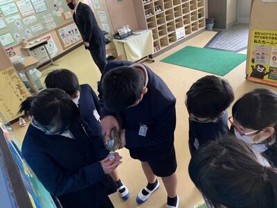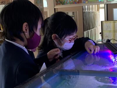 朝から子どもたちに囲まれる「ごしょっこ水族館」。今日も「わあ、きれいになってる!」と声をあげながら、1・2年生の子どもたちが水槽をのぞき込んでいました。昨日の放課後、保護者の方が掃除と海水の入れ替えをしてくださったおかげです。水槽の中では、鯛の稚魚がすくすくと成長しています。