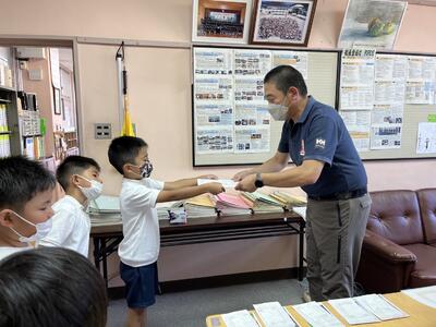 さて、今日は「恐竜絵画コンテスト」の表彰も行いました。7人が賞状と副賞をいただきました。