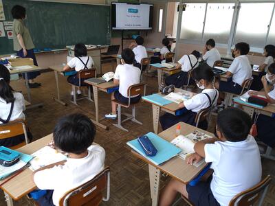 今日は、外国語、外国語活動の授業の日です。英語指導の秋田先生が来てくださいました。
