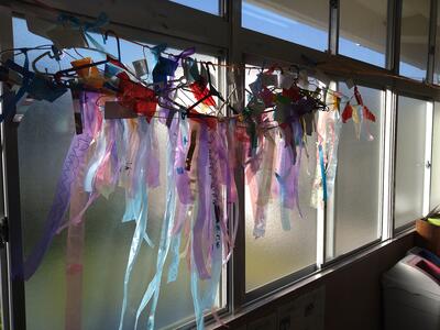 廊下に並んだ七夕飾り。思い思いの願いが綴られた短冊に目を通すと、心が温かくなります。「てっぽうのおもちゃをかってもらえますように」「つりとはぜとりがじょうずになりますように」「おけしょうがじょうずになりますように」「成人したら先生とお酒がのめますように」・・・職員も児童も、それぞれの願いが叶うといいですね。