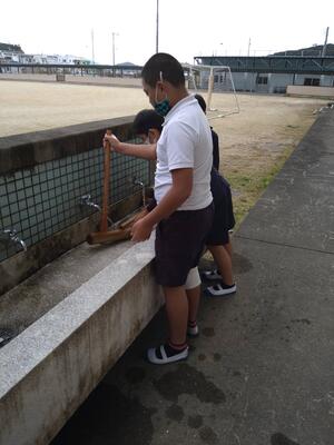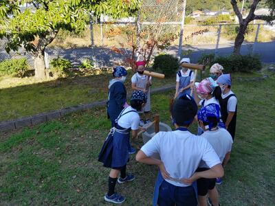 4月に外平で行った田植えから7ヶ月。本日の午後から収穫した餅米を使って5年生がもちつきを行いました。